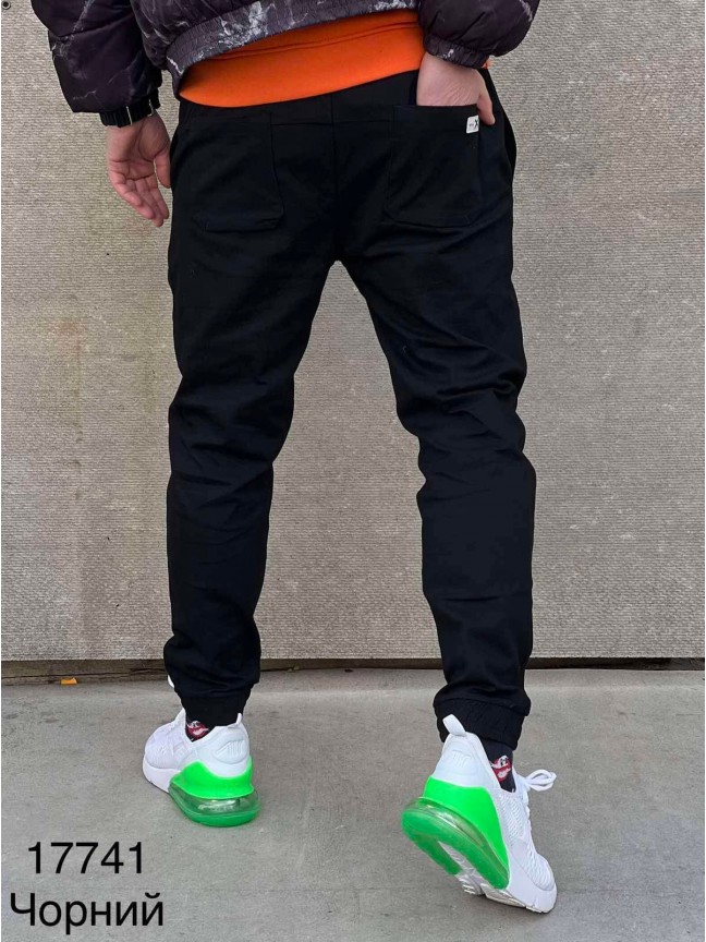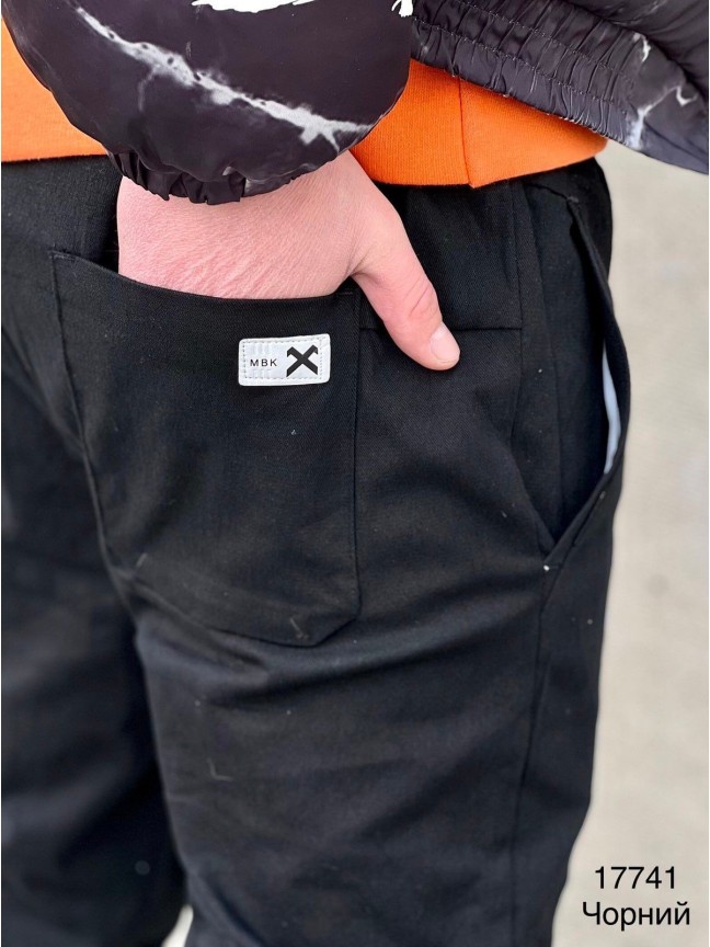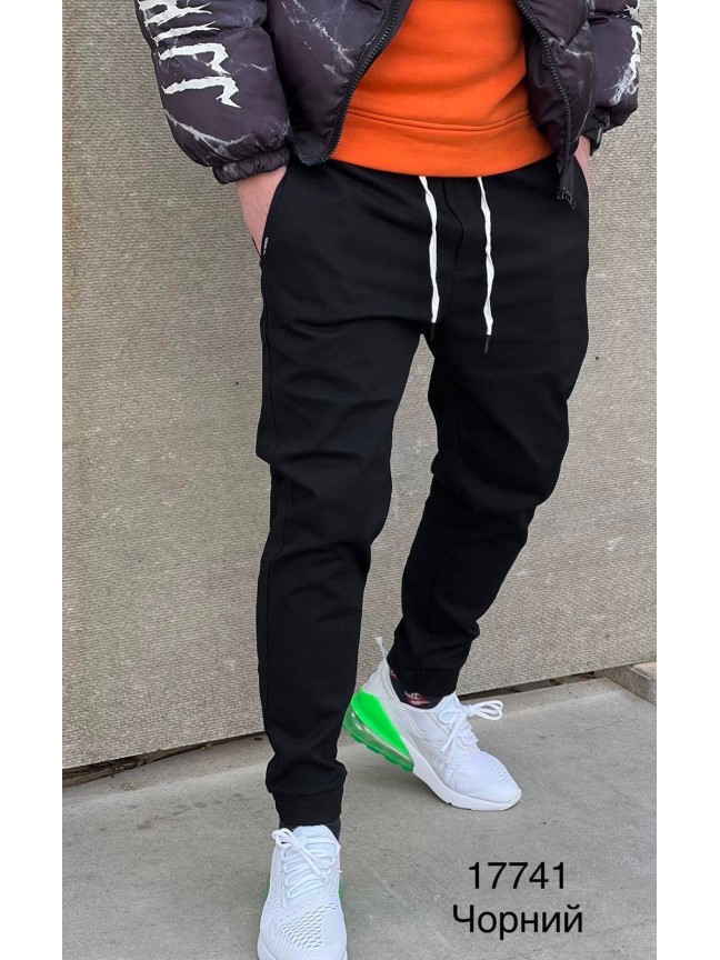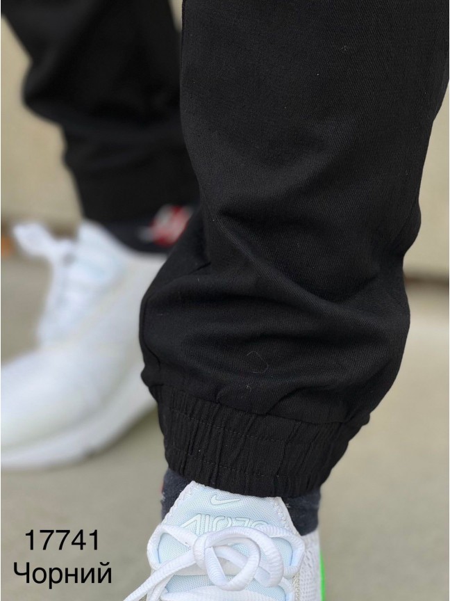 Штани з контрастними, білими нашивками, штанинка в міру завужена, замість манжету гумка.