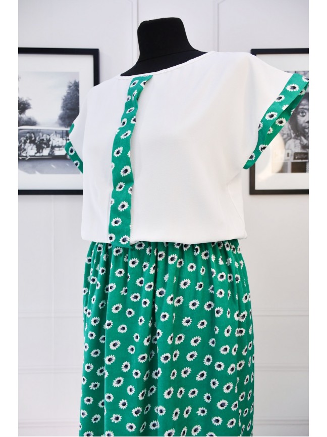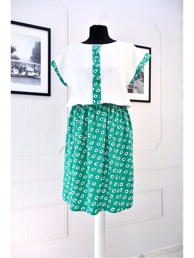 Чудова якість та поєднання різних кольорів оживляють виріб, візуально сукня схожа на костюм . Верх- білосніжний креп шифон з контрастною планкою, по талії-відрізна гумка, а спідниця розсходиться кльошем.